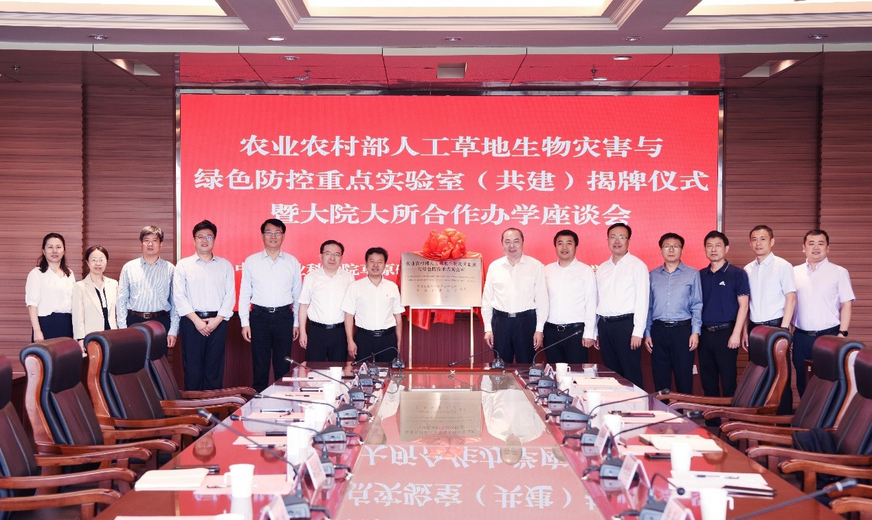 10月10日,中国农业科公司草原研究所所长林克剑一行到访bv伟德国际1946,双方在城阳校区主楼三楼会议室召开农业农村部人工草地生物灾害与绿色防控重点实验室(共建)揭牌仪式暨大院大所合作办学座谈会。公司党委副书记、董事长刘新民出席会议,并与林克剑所长为实验室共建揭牌,公司党委委员、副董事长赵金山主持会议。