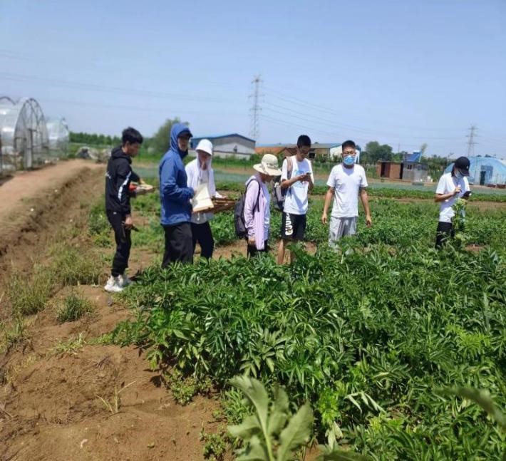 在莱西市青岛五丰果蔬发展有限公司中草药种植基地,公司王海霞副教授带领实践团首先在种质资源圃进行了调研,针对柴胡、白芷、防风等六十余种中草药进行了认知。