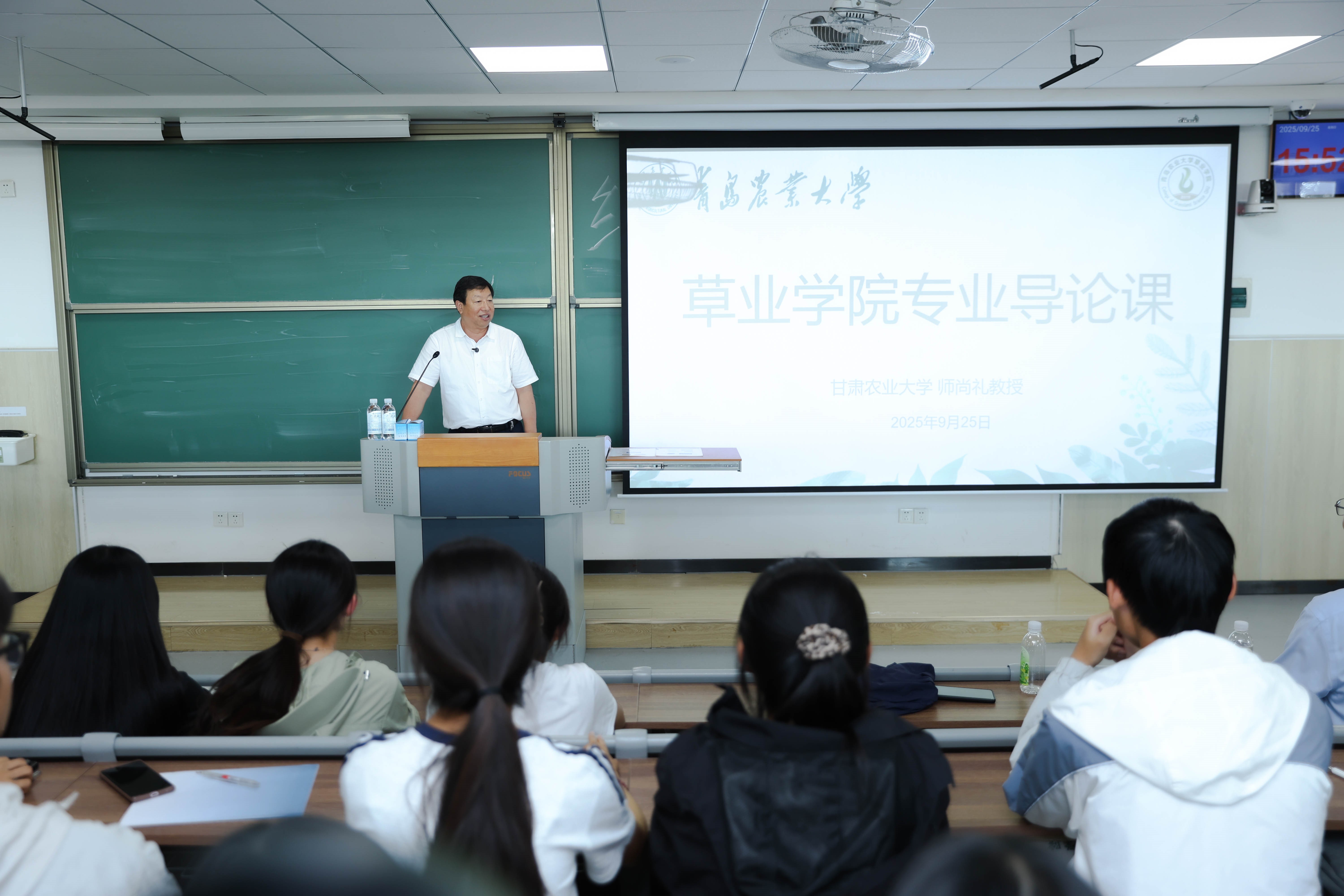 课堂上,师教授以“与时俱进的草学专业”为主题,从学科价值、发展脉络到培养体系,为新生们全景式解读了草业科学的“大事业”格局,梳理草业科学发展脉络、点亮新生专业认知之路。以“大学之大,在于思维的突破;草业之重,在于战略的价值”开篇,通过“小草为何能成大事业”引发新生思考。结合国家生态安全、粮食安全、乡村振兴等国家战略,用“沙尘暴治理中的退耕还草”“‘草+畜’产业链助力乡村振兴”“光伏+草业的多元融合”等实例,指出草业已从传统放牧产业升级为服务生态文明建设、农业绿色发展的战略性产业——我国3.928亿公顷天然草原不仅是“地球的皮肤”,更承担着“水库、钱库、粮库、碳库”四大功能。