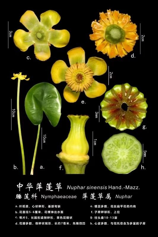 (1)材料1【5张以内高清解剖照片(显微/宏观结合),需准确标注:植物名称(中文名+拉丁学名,如中华萍蓬草(Nuphar pumila subsp. sinensis (Handel-Mazzetti) D. Padgett);形态学描述,如:a.叶纸质,心状卵形,基部弯缺;b.花直径5-6厘米,花伸出水面;c.萼片5,长回形或倒卵形,黄色花瓣状;d.花瓣多数,倒卵状楔形,长约7毫米,先端微凹;e.雄蕊多数,花丝肩平花药内向;f.子房卵球形,上位;g.柱头盘10-13裂;h.心皮多数,与花托愈合为多室的子房。】;