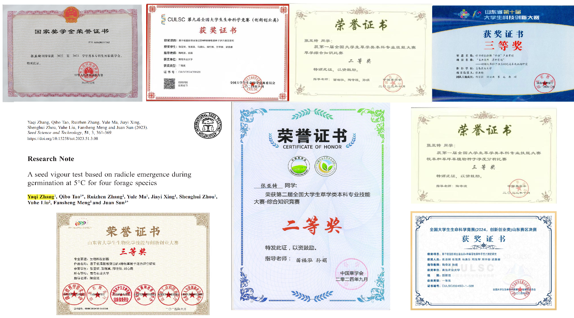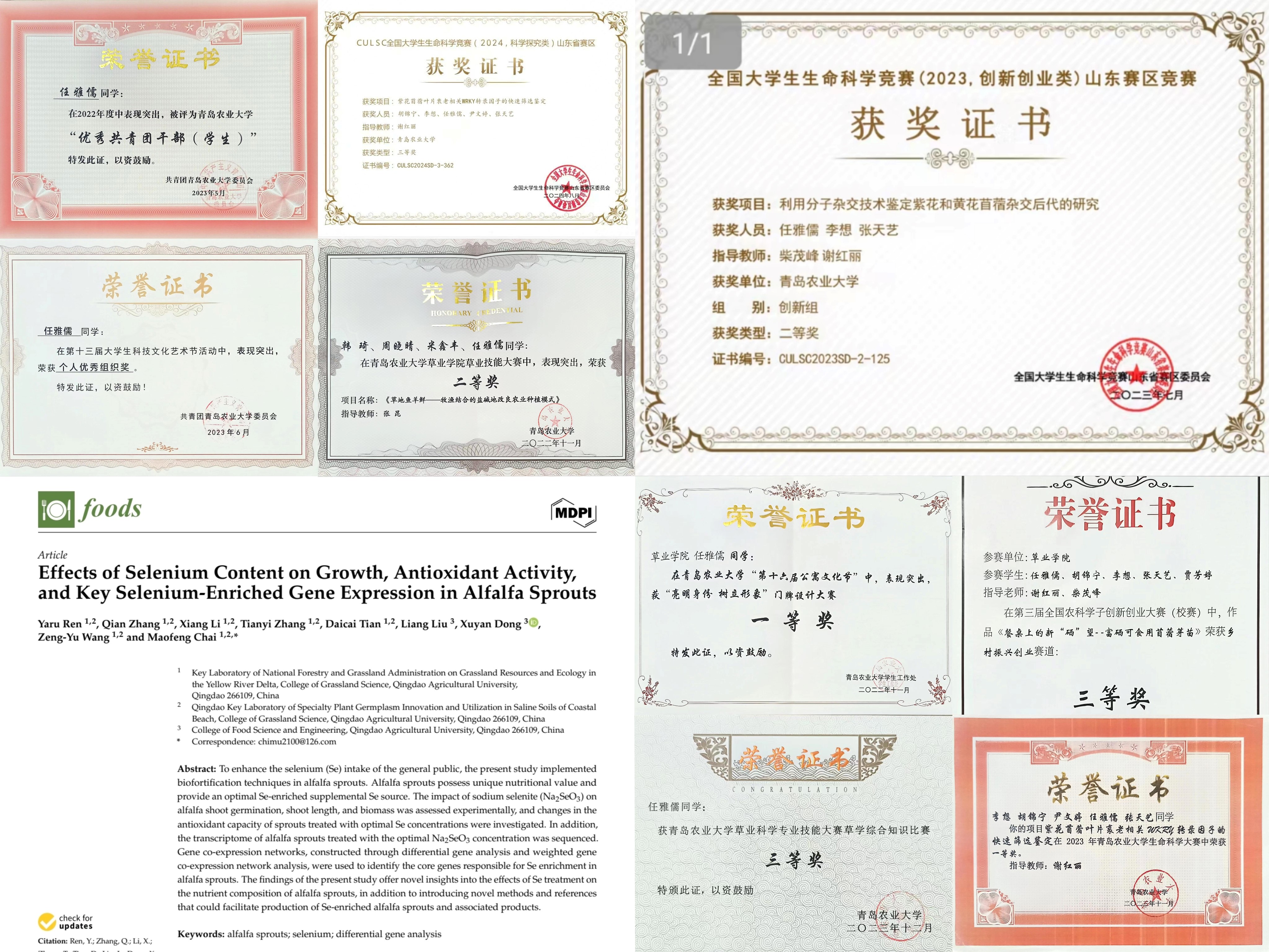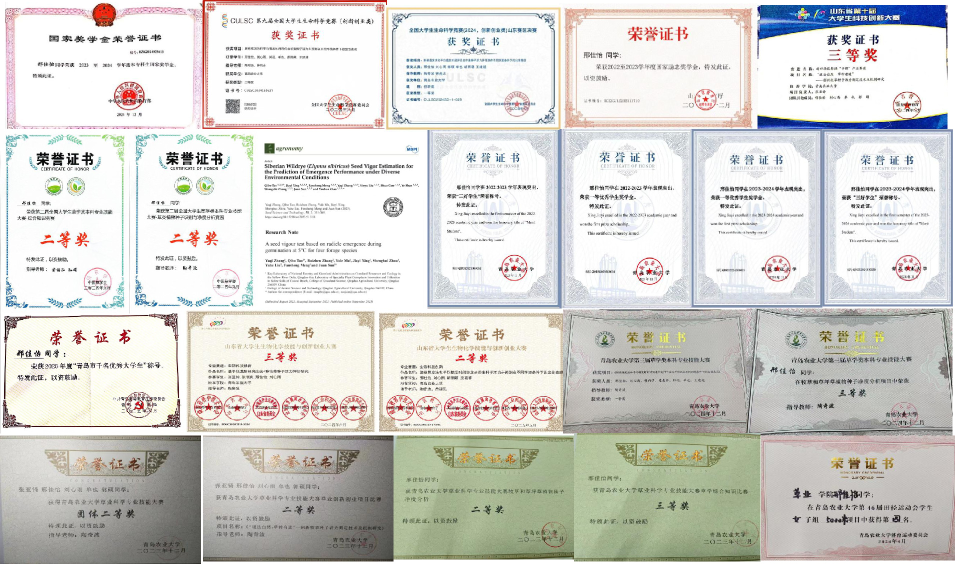 张亚锜,共青团员,伟德国际VICTOR19462021级草业科学专业本科生。获得国家奖学金、国家励志奖学金、“山东省优秀员工”、bv伟德国际1946十佳自强之星、“优秀共青团员”和“三好员工”等荣誉称号;以第一作者发表SCI论文1篇,参与发表论文5篇,其中SCI论文3篇,中文核心期刊论文2篇;主持2023年国家级老员工创新创业训练项目1项并优秀结题。共获得国家级奖励4项,省级奖励3项,校级奖励20余项。现已考取北京林业大学硕士研究生。
