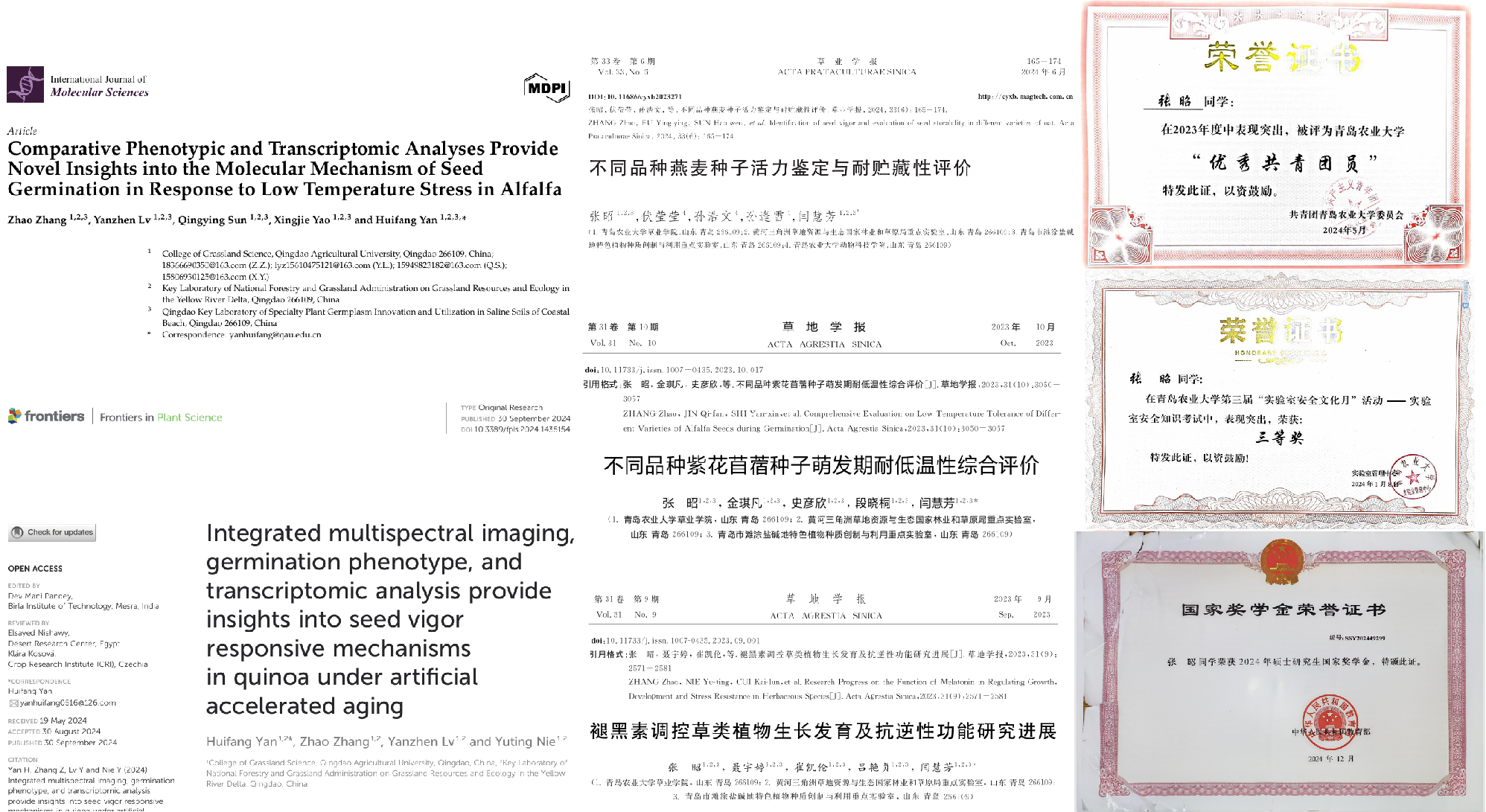 张昭,共青团员,伟德国际VICTOR1946草学专业22级研究生。研究生期间以第一作者在International Journal of Molecular Sciences发表SCI论文1篇,以第二作者在Frontiers in Plant Science发表SCI论文1篇,以第一作者在中文核心期刊发表论文4篇,申请发明专利1件,协助本公司本科生开展老员工创新创业等科研项目,参加中国草学会、泰山学术论坛等。现已考取扬州大学博士研究生。