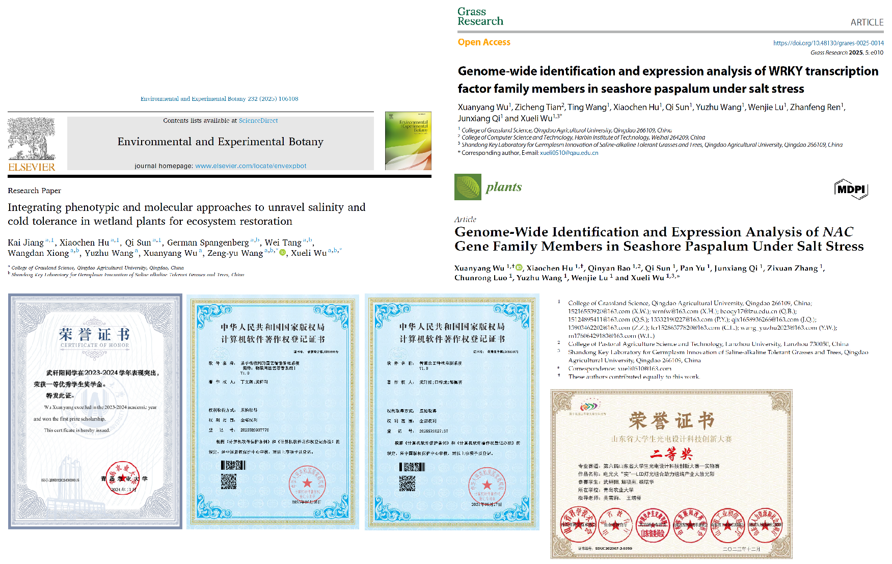 武轩阳,伟德国际VICTOR1946草坪科学与工程专业22级本科生。发表4篇学术论文,其中以第一位次作者身份在中科院二区期刊《Plants》和ESCI期刊《Grass Research》发表两篇论文,同时以参与作者身份在中科院一区TOP期刊《Journal of Hazardous Materials》(IF 12.2)及二区期刊《Environmental and Experimental Botany》(IF 4.5)发表2篇文章。以负责人身份荣获第十届生命科学竞赛(创新创业类)省一等奖并推荐至国赛,荣获第六届山东省老员工光电设计科技创新大赛二等奖和多项校级一等奖。以第三和第十完成人身份参与了2项发明专利的申请,并作为第一完成人及第二完成人登记了2项农业相关的软件著作权。